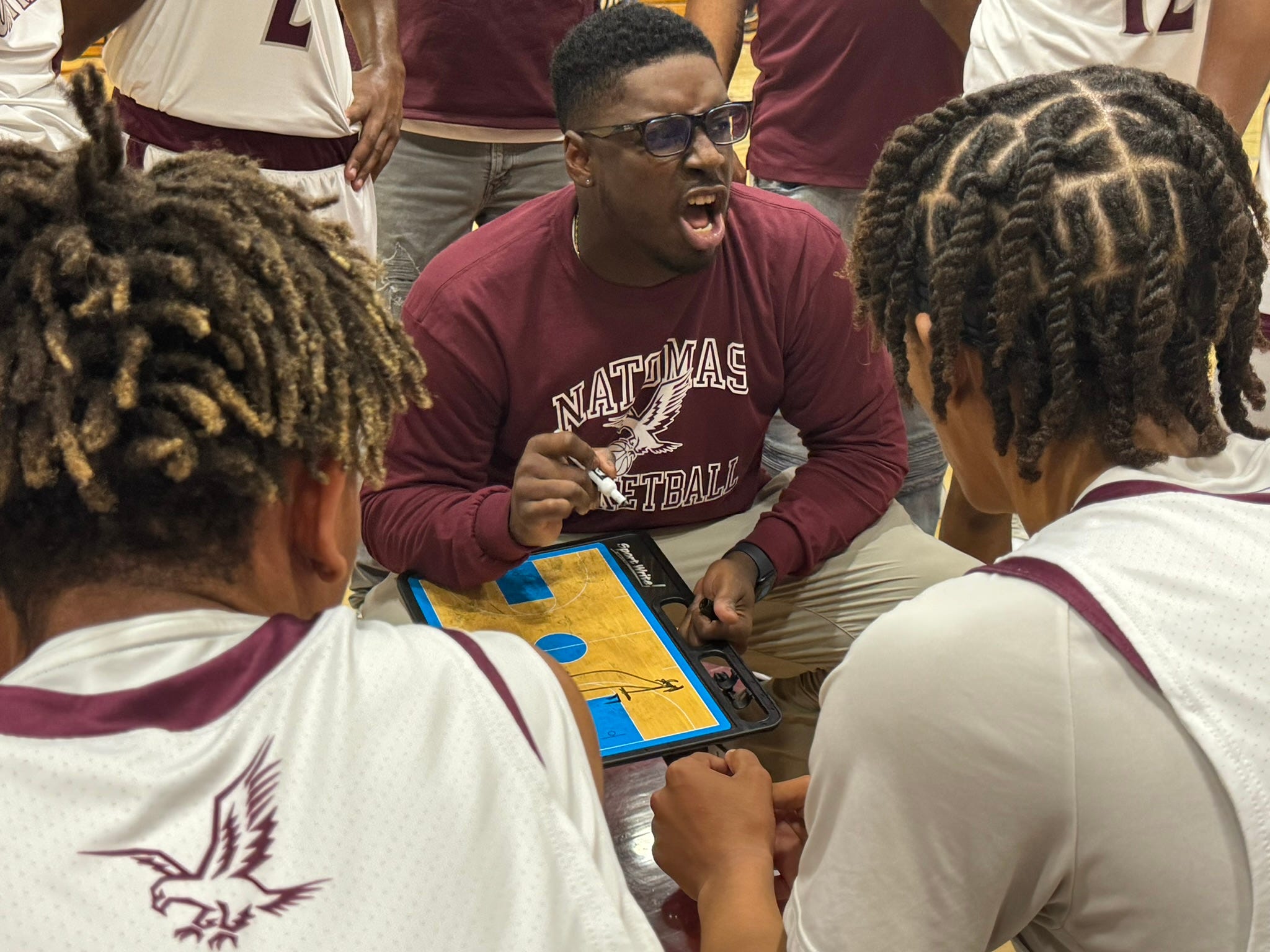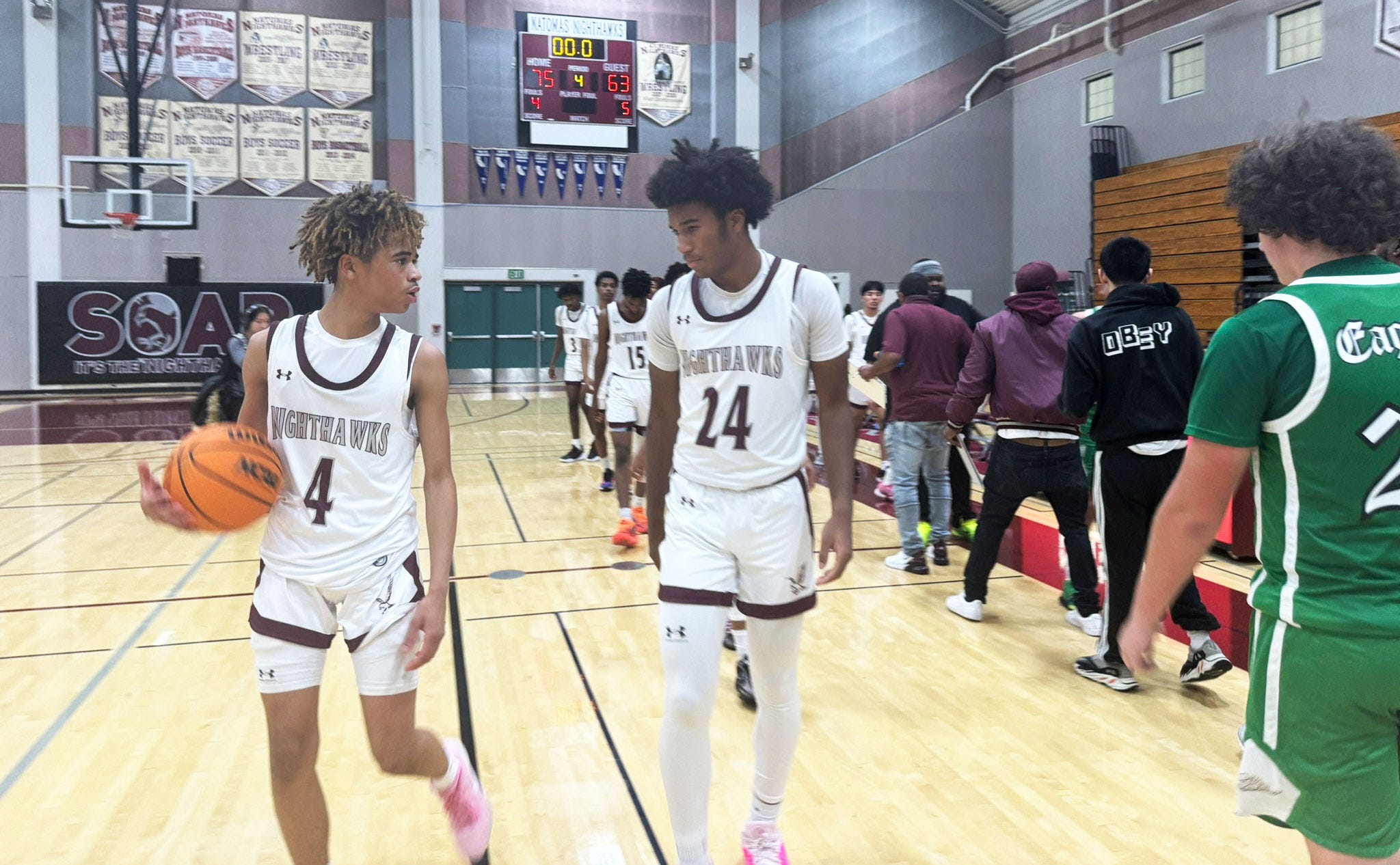 After Harold gives Natomas a 67-55 lead with five minutes to play, the Nighthawks go scoreless for nearly four minutes. An El Camino 3 narrows the lead to five. With under two minutes, the Eagles have the ball with a chance to cut the lead to one possession.