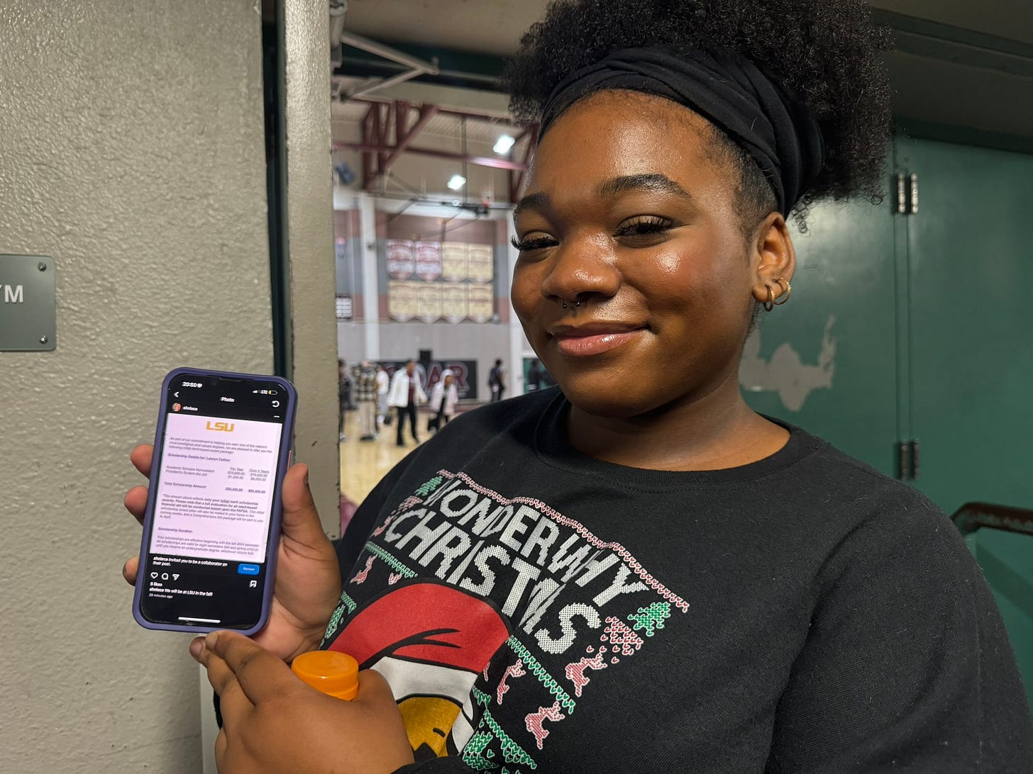 “Coach, I got a scholarship to LSU!” Lauryn declares, turning her phone for all to see.